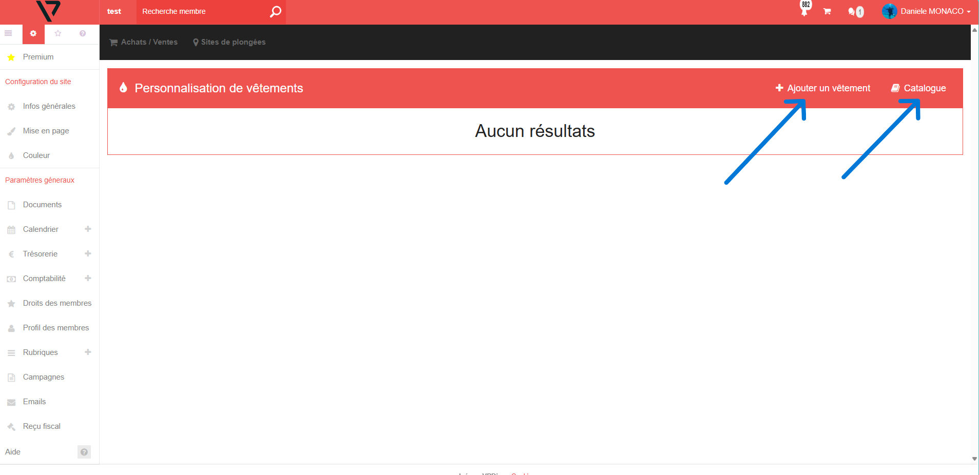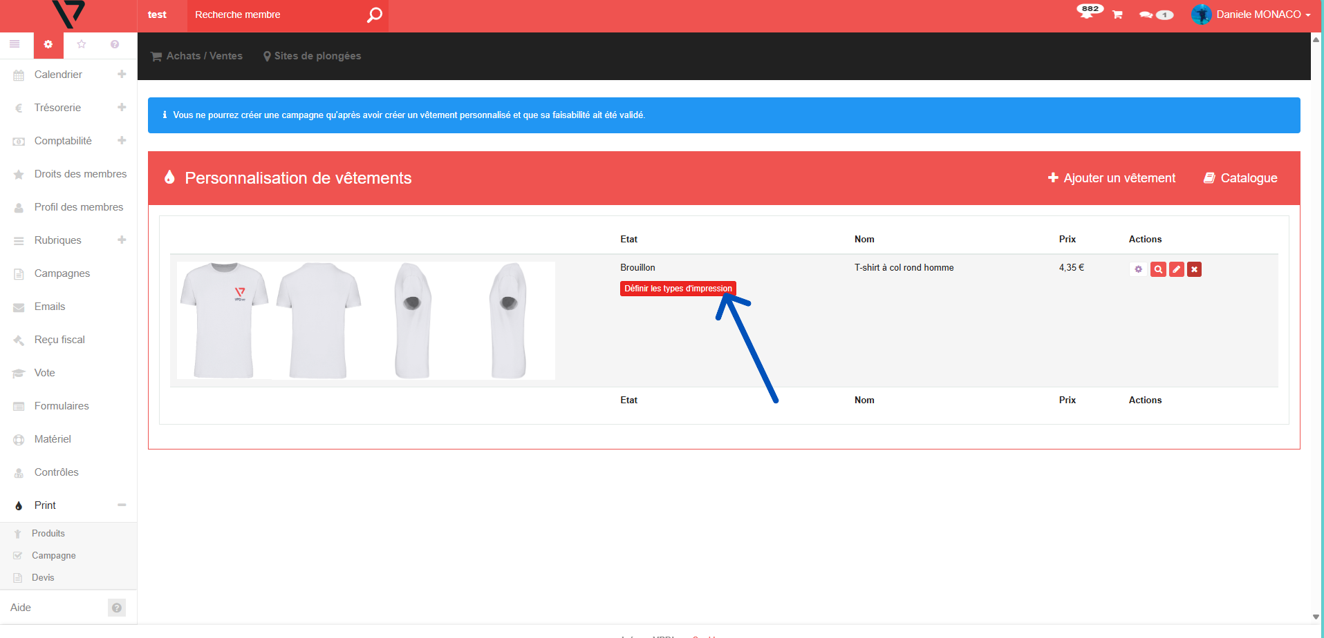 Rendez-vous sur votre espace VPDive et cliquez sur l’icône de la roue crantée, puis sur Print > Produit. Avant de commencer, vous pouvez consulter le catalogue des vêtements disponibles. Même si toutes les références ne sont pas encore en ligne, elles seront ajoutées progressivement selon vos demandes.